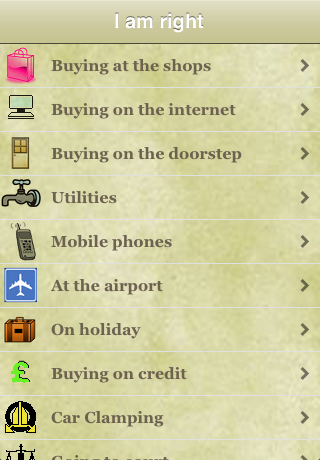iAmRight - Know your consumer rightsHow would you like to: Challenge the snooty shop assistant who insists you have no rights? , Know what to do when the goods you ordered on-line turn out to be faulty?, Sort out your problem when your holiday hotel is overbooked? , Feel confident when signing a credit agreement?, Know the law if your car is clamped? , Recognise a scam before it costs you money? Then this is the App for you. Developed by a Trading Standards professional; with more than 12 years experience in dealing with consumer problems this App gives you concise advice on how to deal with common consumer issues. Have the information to hand on your phone, whenever you need it. Features advice on: Buying at the shops, Buying on the internet, Buying on the doorstep , Utilities, Mobile phones, At the airport, On holiday, Buying on credit, Car clamping, Going to court , Buying a car, Fakes, frauds and scams |
