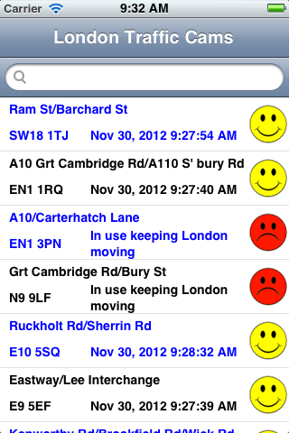 Live London Traffic CamerasCheck out how the traffic is flowing in London in real time. Data supplied from cameras located around the city As well as seeing the live images from over 300 cameras you can use the map facility to find the location of each camera This is a useful app to see how the traffic is moving before you set off on your journey. Your phone/ipad must be connected to 3G or wifi to ensure that you receive the live CCTV images. |